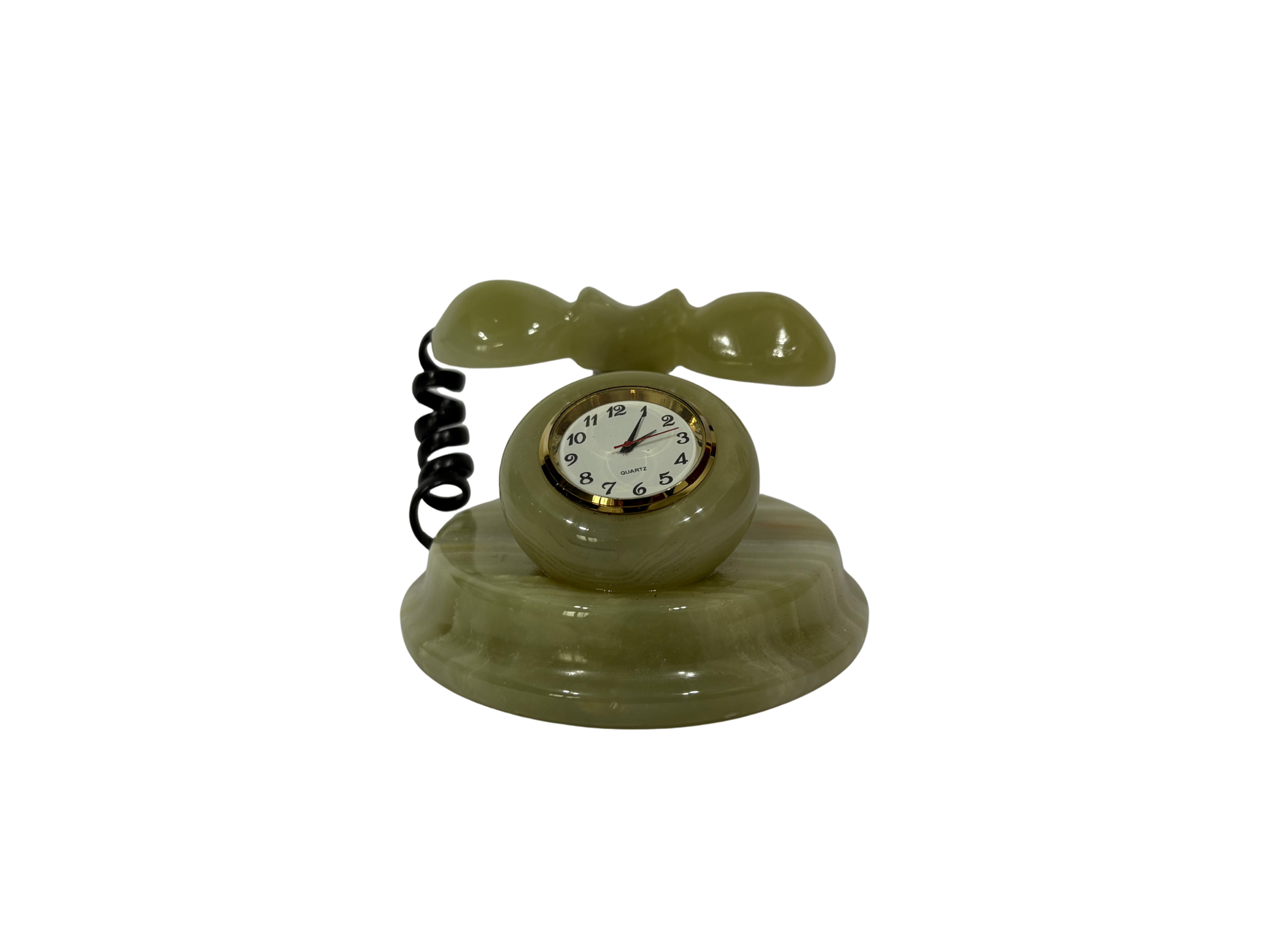 This unique clock looks just like a vintage rotary phone but is made from beautiful, polished stone. It’s a great choice for anyone who loves old fashioned style or collecting cool items. The clock has a classic gold trim that looks perfect against the natural, earthy colors of the marble.